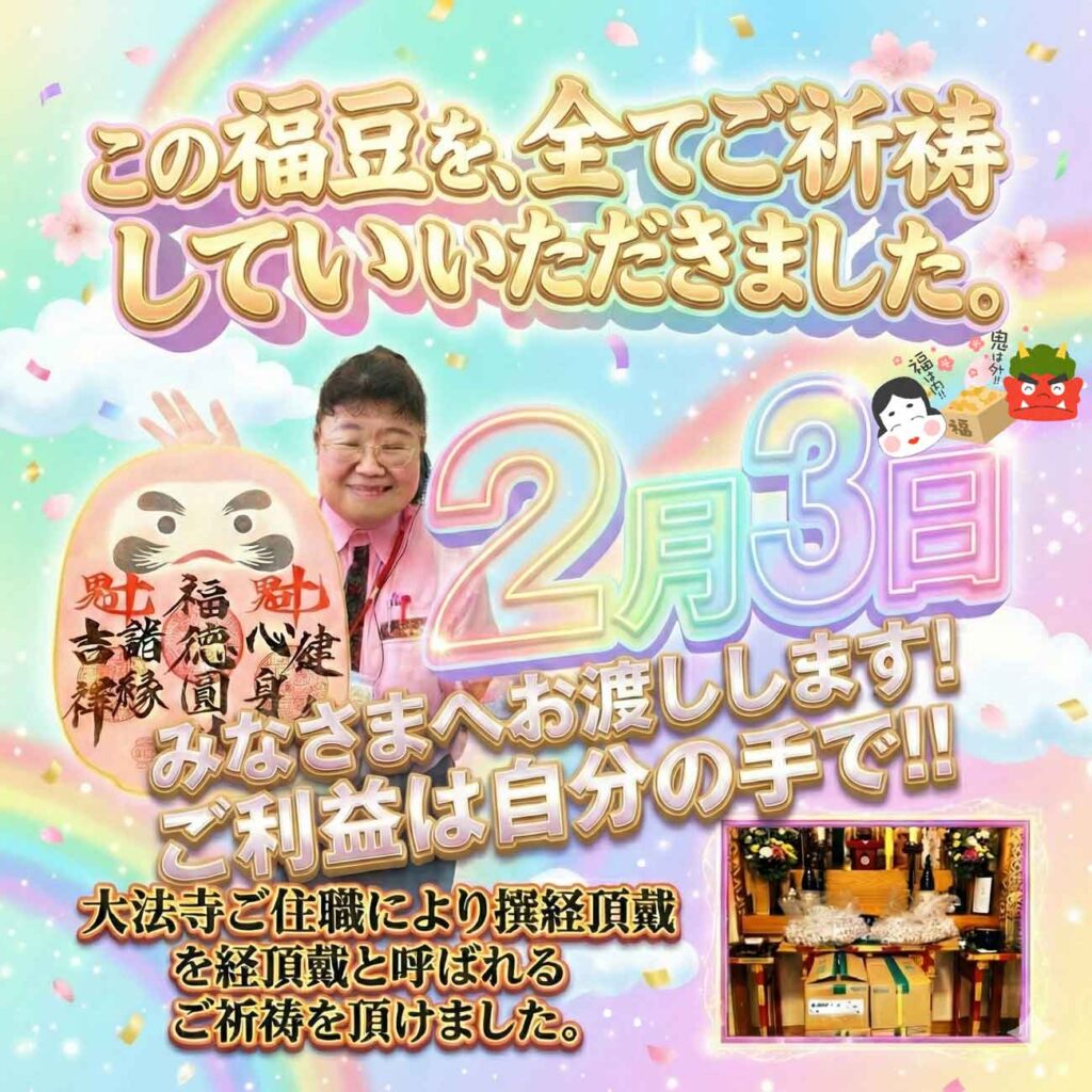 当店の福豆は、地域で信頼される大法寺の授与品です。大法寺では厳粛にご祈祷を行い、厄除け・開運・無病息災などを祈願して授与されています。お受け取りいただく福豆は、寺院のご加護が込められた縁起物としてご家庭の平安を願うものです。詳しくは大法寺公式サイトをご参照ください